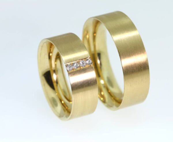 Een paar gouden trouw ringen.